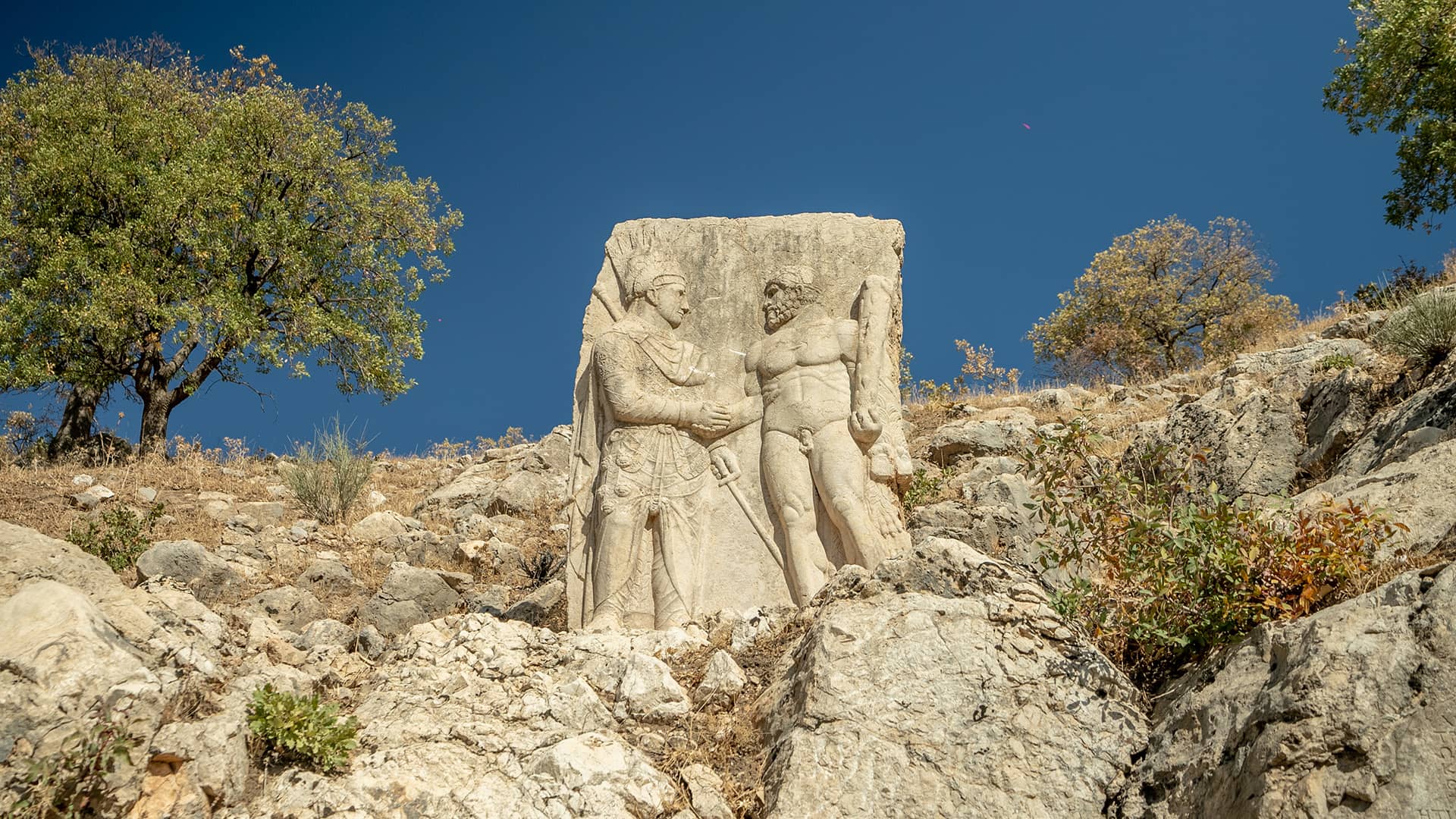 Antiochus I, who watched the sunrise and sunset from the same throne as the gods, had statues made of himself together with the deities Commagene (Tyche), Zeus–Oromasdes, Apollo–Mithras, and Heracles–Artagnes. On thrones about ten meters high, the colossal statues of the king and the gods sit in rows, accompanied by a guardian eagle symbolizing the celestial sovereignty of the Commagene Kingdom and a lion symbolizing its earthly power.