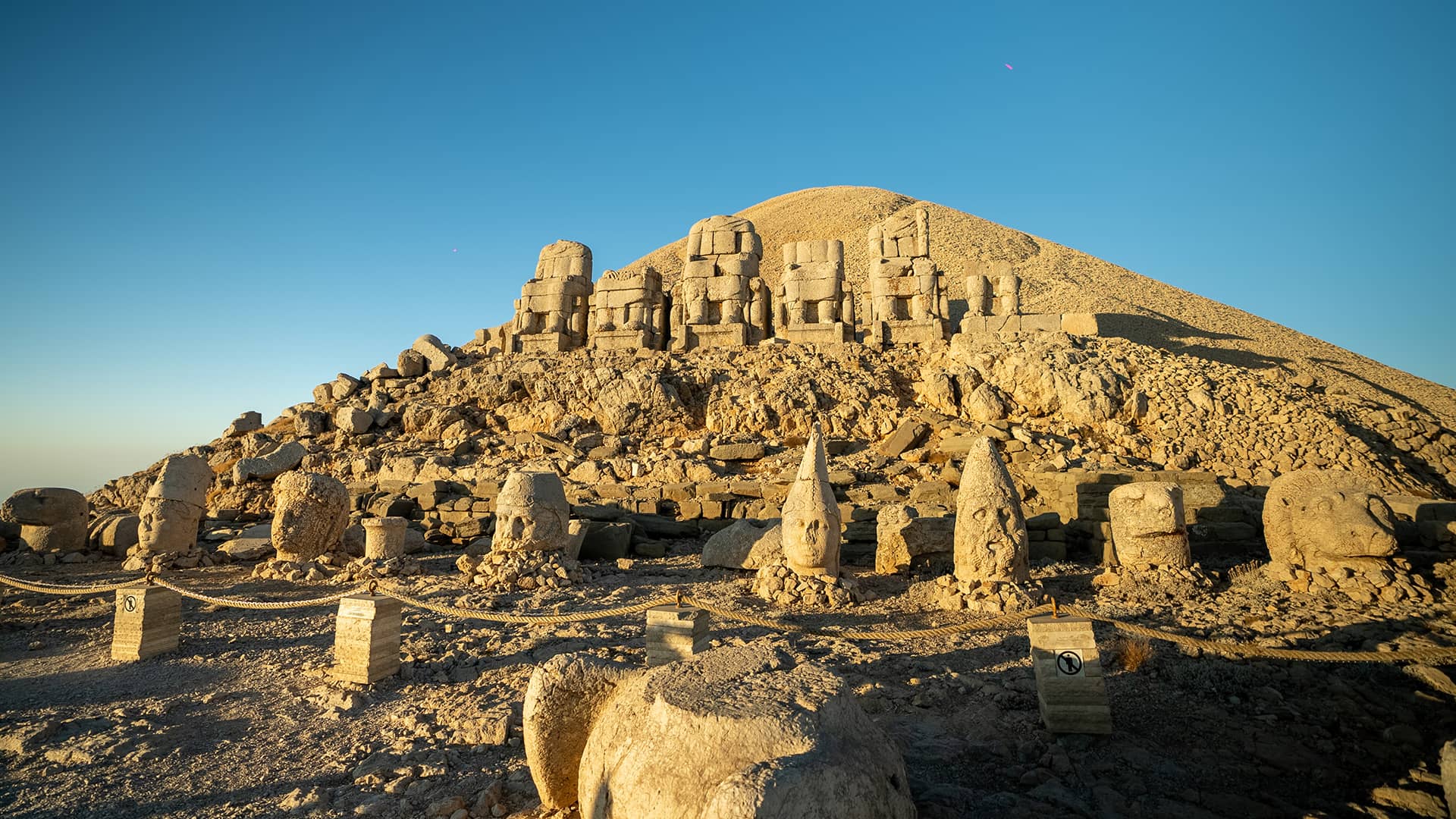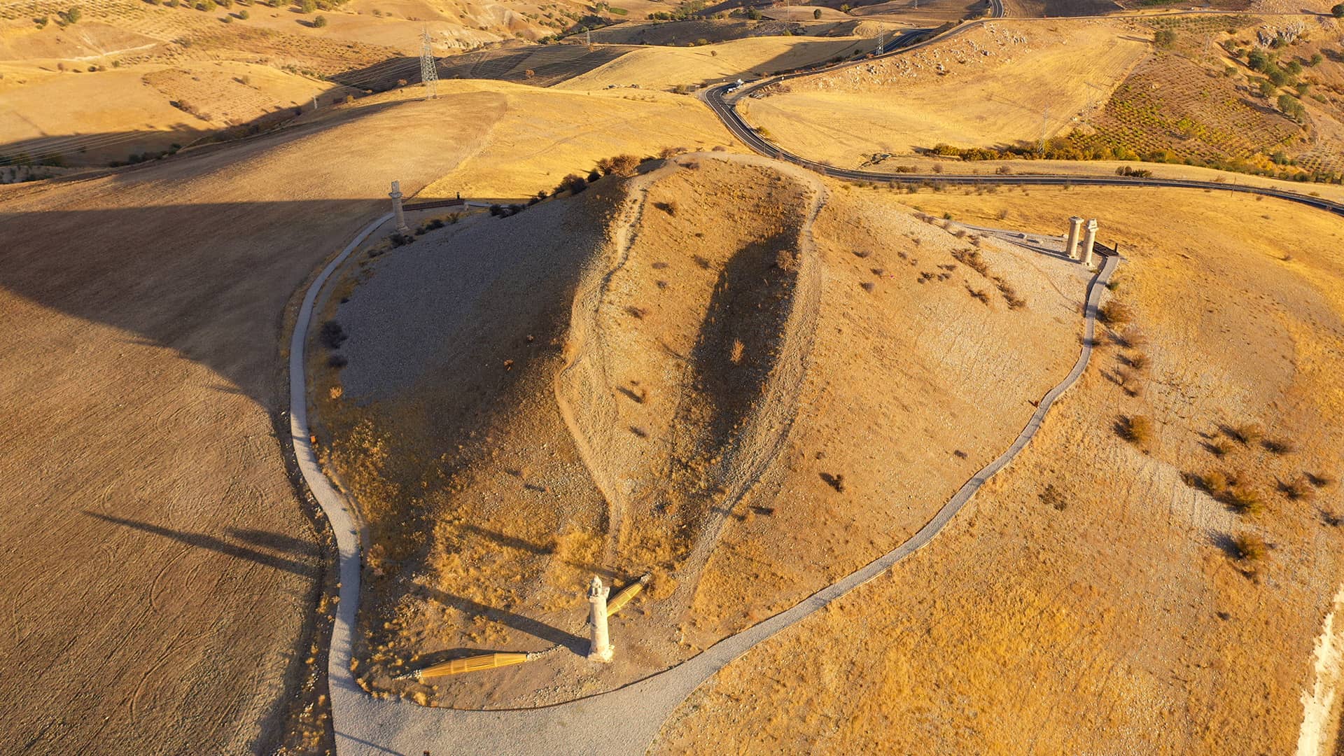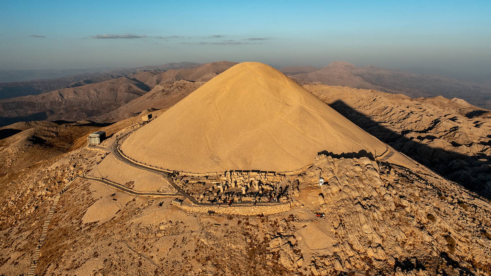 Although its original height was 55 meters, the height of the tumulus has decreased to about 50 meters due to centuries of natural and human impact. Formed by piling up crushed stones with a total volume of 30,000 cubic meters, the tumulus is known to be the monumental tomb of King Antiochus I of Commagene.
