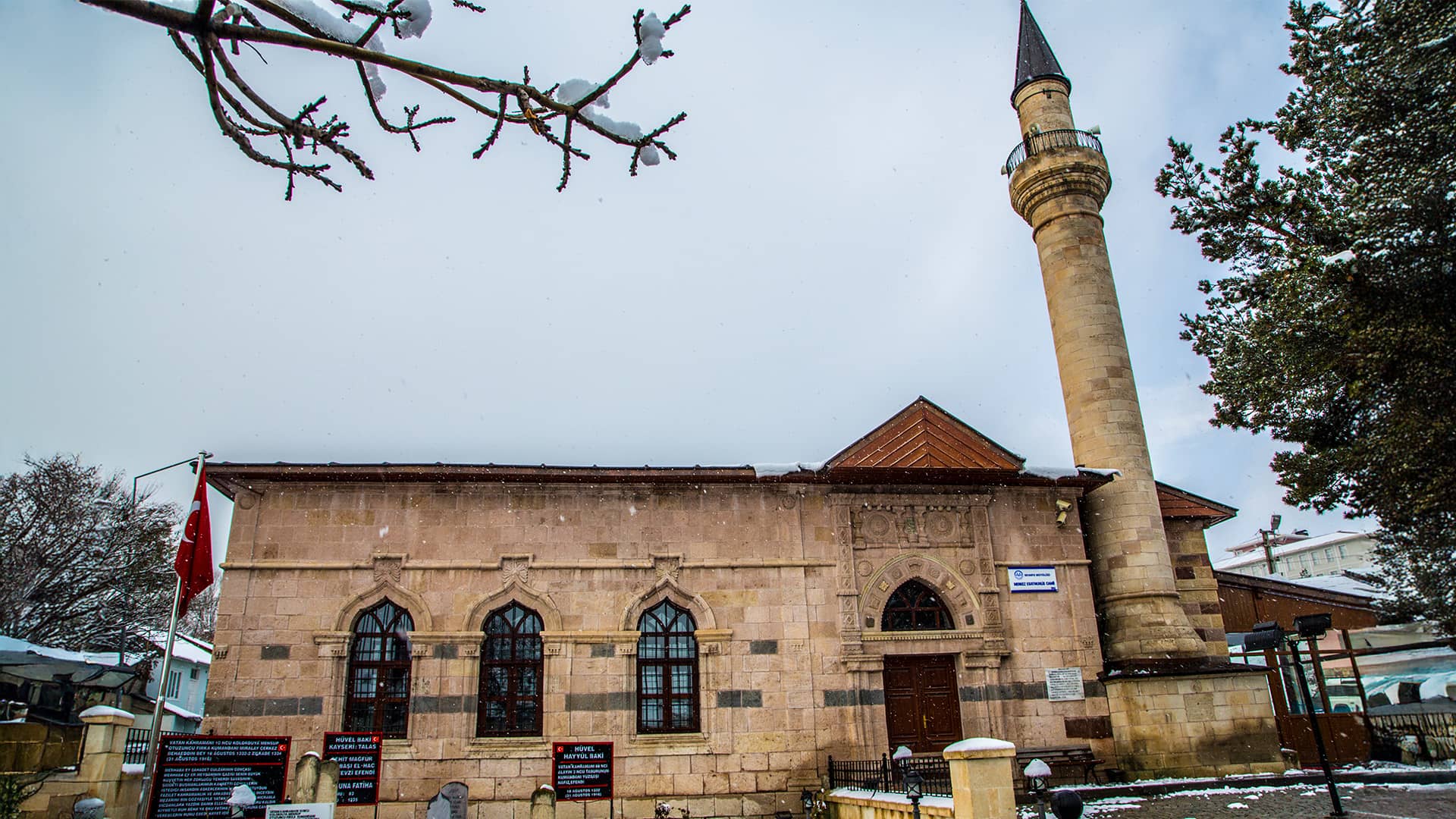 Located in the district of Refahiye in Erzincan, the Central Mosque was built in the second half of the 19th century. As its inscription has not survived to this day, its patron and exact date of construction are unknown.Built from locally quarried stone, the mosque fully reflects Western influence. The fact that the architects and craftsmen were influenced by church architecture is evident from its entrance door and pointed-arched windows. It has a rectangular plan and is covered with a hipped roof. Above the entrance door, the continuation of the roof forms a triangular pediment. Its cylindrical minaret, standing on a stone base, is built of cut stone and has a single balcony. In the middle of the large courtyard surrounding the mosque lies the Bahattin Pasha Martyrdom.
